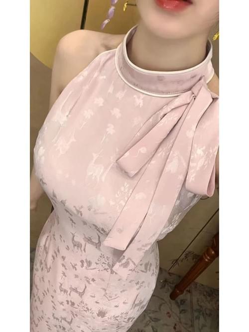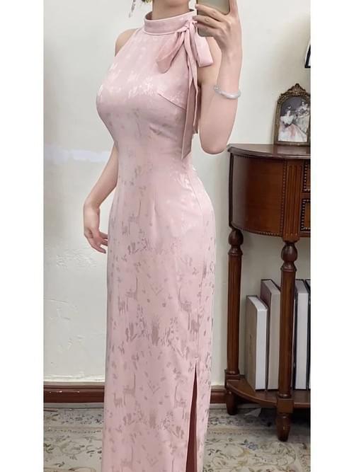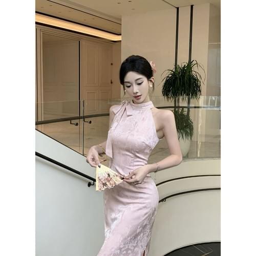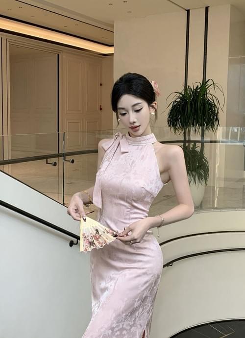 daidai (Ready Stock) Women Sleeveless Long Yellow Pink Cheongsam Dress Qipao Elegant Dinner