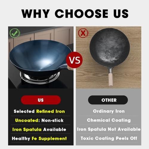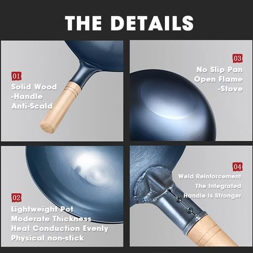 -Perfect wooden handle which avoid the injure and empyrosis while cooking, and the material of beech handle is not loosed.